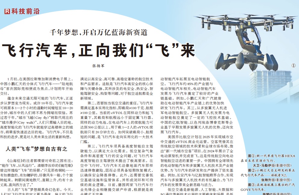 编者按 1月17日,《人民日报》国际科技专版(第16版)刊发了h图书馆 零碳交通研究中心、h图书馆 车辆与运载学院教授、(车辆学院)飞行汽车动力研究中心主任张扬军《飞行汽车,正向我们“飞”来》文章。文章以小鹏汇天“陆地航母”亮相美国拉斯维加斯消费电子展为切入点,描绘了未来“City fly”可能取代“City walk"的场景,同时回顾了飞行汽车历经千年梦想与百年探索的历程,并展望了在电动智能时代,飞行汽车有望...