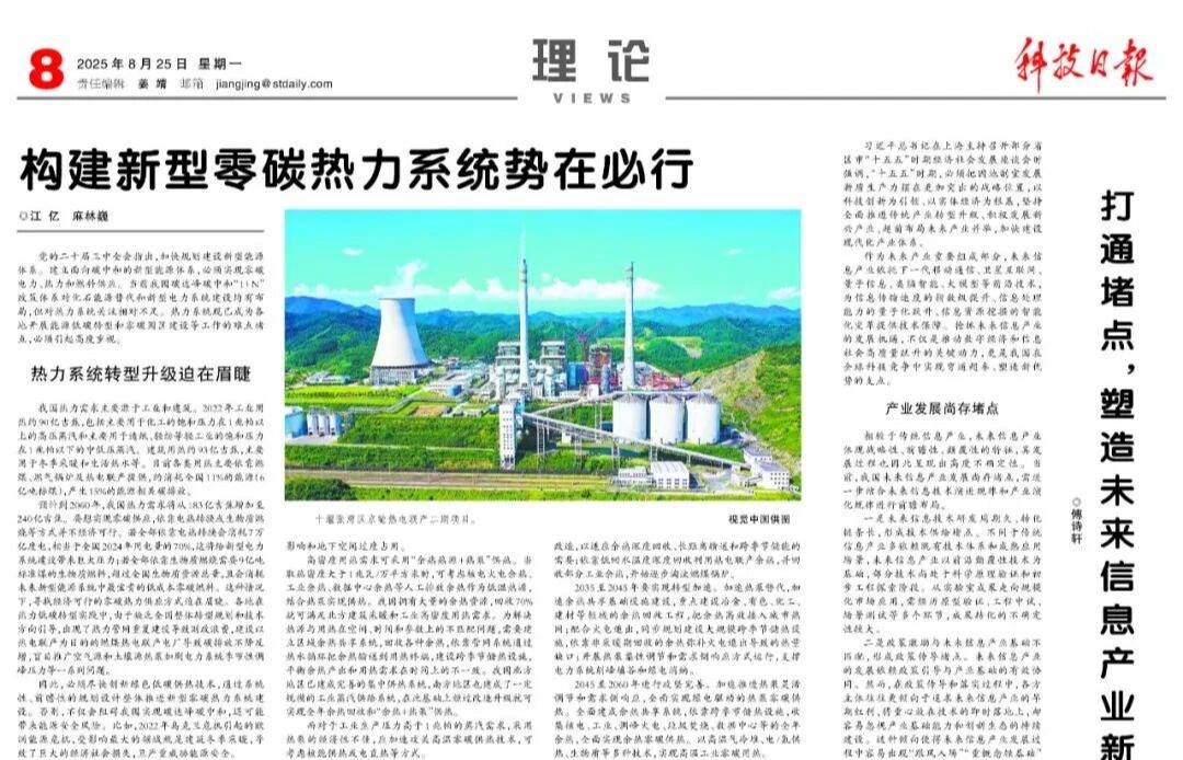 转载来源:《科技日报》2025-08-25 第08版:理 论构建新型零碳热力系统势在必行党的二十届三中全会指出,加快规划建设新型能源体系。建立面向碳中和的新型能源体系,必须实现零碳电力、热力和燃料供应。当前我国碳达峰碳中和“1+N”政策体系对化石能源替代和新型电力系统建设均有布局,但对热力系统关注相对不足。热力系统现已成为各地开展能源低碳转型和零碳园区建设等工作的难点堵点,必须引起高度重视。热力系统转型升级迫在...