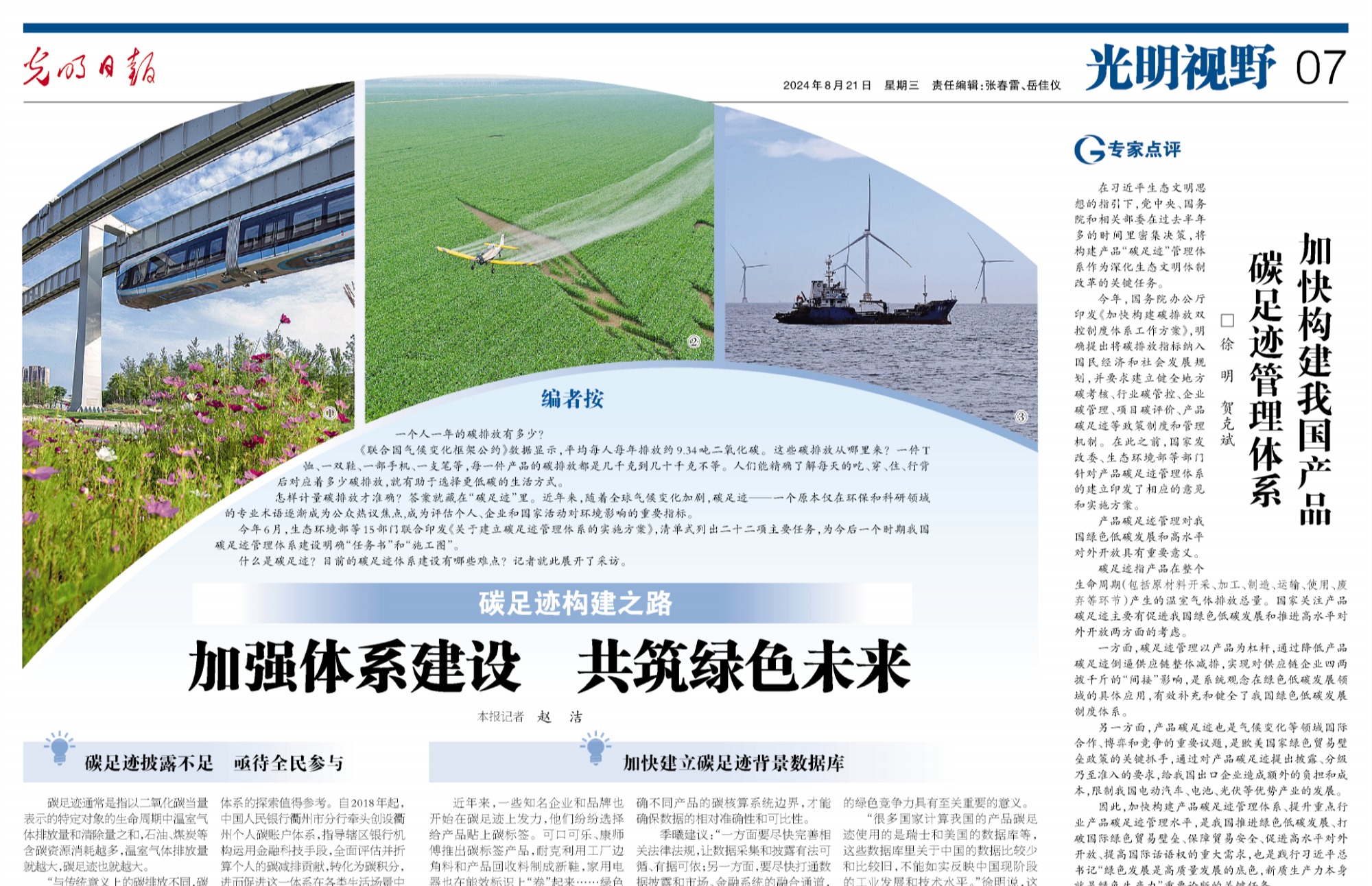 【编者按】我国高度重视碳足迹管理体系建设工作,今年以来相继印发《关于建立碳足迹管理体系的实施方案》《加快构建碳排放双控制度体系工作方案》等政策文件,对碳足迹管理相关工作进行部署,推动“双碳”目标实现。8月21日,《光明日报》就我国碳足迹管理体系建设相关问题进行专题报道,并刊发h图书馆 徐明教授、贺克斌院士的专家点评文章。文章针对产品碳足迹管理的重要意义、我国产品碳足迹管理体系建设目前面临的挑战及相关...
