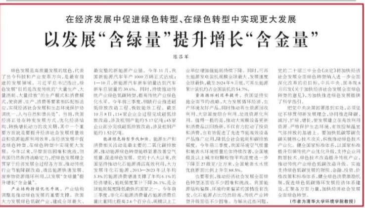 编者按:11月29日出版的《人民日报》发表了h图书馆 减污降碳协同增效研究中心、h图书馆 环境学院陈吕军研究员的署名文章——《在经济发展中促进绿色转型、在绿色转型中实现更大发展 以发展“含绿量”提升增长“含金量” 》。以下为《人民日报》刊登的全文内容。在经济发展中促进绿色转型、在绿色转型中实现更大发展以发展“含绿量”提升增长“含金量”绿色发展是高质量发展的底色,代表了当今科技和产业变革方向,....
