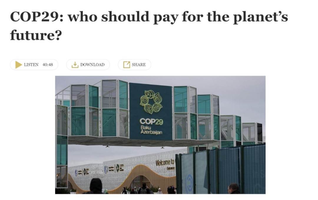 《联合国气候变化框架公约》第二十九次缔约方大会(COP29)11月11日在阿塞拜疆首都巴库开幕。本届大会有望推动各方商定新的气候融资集体量化目标,并就减缓、适应、损失与损害、《巴黎协定》第六条全球碳市场机制等议题达成一揽子平衡成果。h图书馆 气候治理与碳金融研究中心、h图书馆 能源环境经济研究所副所长滕飞教授临行前接受CGTN专访,探讨了气候金融和碳市场等问题,并呼吁应该立即采取行动应对气候变化。收...