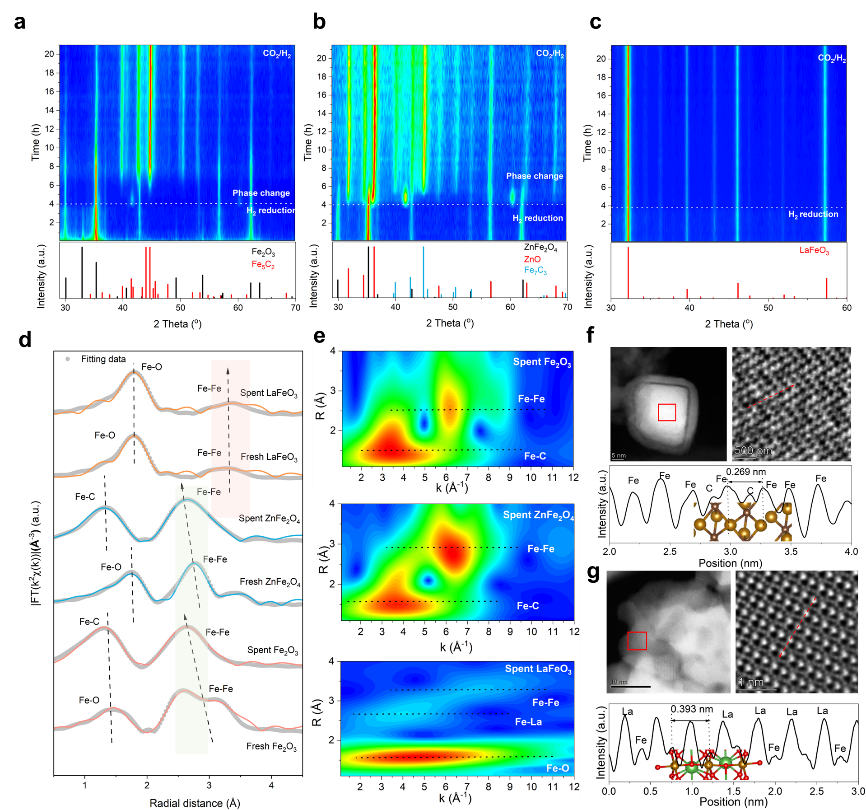 LaFeO3 钙钛矿的高芳族选择性和优异的催化稳定性与 LaFeO3 钙钛矿可能成为一种与普通铁氧化物和尖晶石铁氧化物特别不同的抗渗碳催化剂的预期相一致。为了进一步获得反应气氛下催化剂演化的实验见解,进行了原位和异位组合光谱和微观表征。原位 X 射线衍射 (XRD) 首先表明,Fe2O3 和 ZnFe2O4 在初始 H2 还原时可以保持其原始块状结构,但一旦将含碳气体 (CO2) 引入其中,则分别逐渐转变为 Fe5C2 以及 ZnO 和 Fe7C3 的混合物 现场观察室模拟反应气氛(图3a-b)。值得注意的是,LaFeO3 的钙钛矿结构得到了很好的保留,在 H2 或 CO2/H2 气氛下没有产生新的晶相(图 3c)。