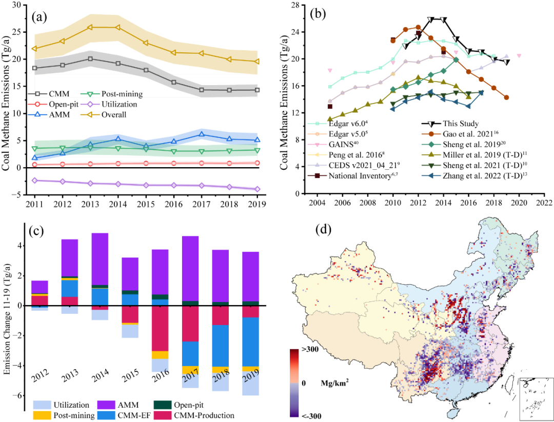 结果表明,中国在2011~2019年间淘汰了大约1.2万个落后煤矿,这些关闭的煤矿排放了大量的AMM,是此前研究的估计的2~10倍。通过对AMM排放的修正提升了现有清单的准确度和透明度,使得基于“自下而上”方法的甲烷排放清单数据与基于“自上而下”的反演研究结果的差异缩小了53%。研究还发现,由于关闭矿井的瓦斯含量通常较高,以及低甲烷排放的露天煤矿产量的增加,中国单位煤炭生产的平均排放因子从2013到2019年间下降了23%。因此,虽然中国近年来煤炭产量还在增长,但煤炭甲烷排放已经达峰。