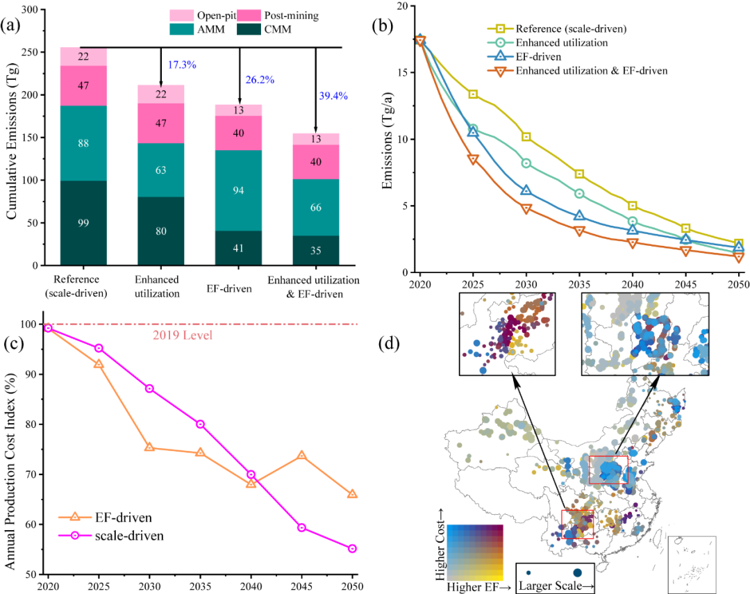 研究进一步比较了不同的煤矿关闭策略对煤矿甲烷排放的影响。研究发现,如果在未来优先关闭高瓦斯煤矿,将使得2020至2050年间的累计甲烷排放减少26%,减排效果远大于回收矿井瓦斯并利用的传统减排举措。除了气候效益,该策略也将降低未来的煤炭生产成本。因此,中国当前的煤矿关闭策略(优先关闭小煤矿)可能已经不再适用。作为一种切实可行的替代方案,本研究建议优先关闭规模较小、瓦斯含量高、生产成本高的煤矿,主要位于西南地区,并将煤炭生产集中在西北和北部地区,这些地区的煤矿排放因子和生产成本较低,煤矿规模较大。