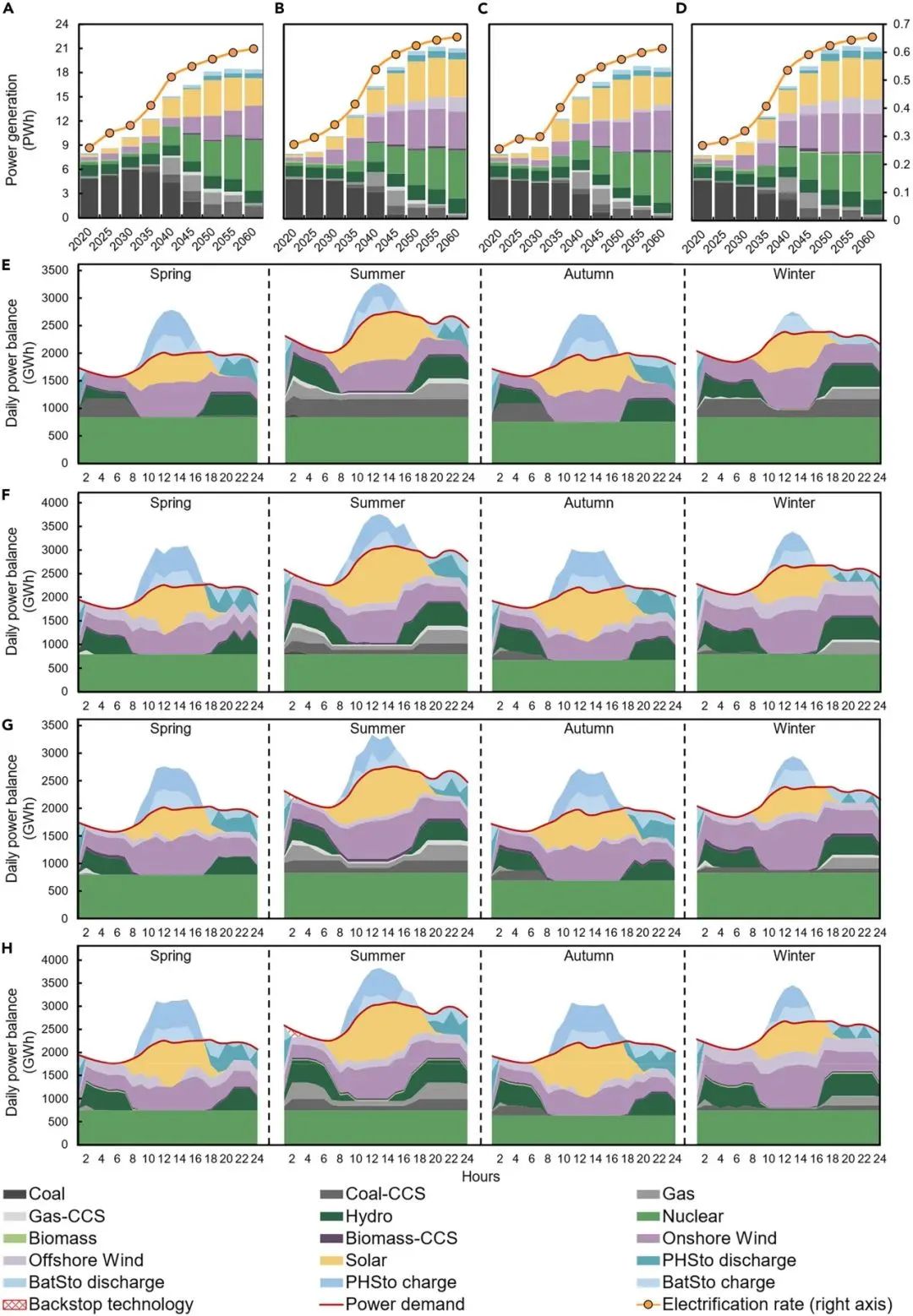 图2. 不同净零排放情景下的电力组合、电力化率和小时级电力供需平衡