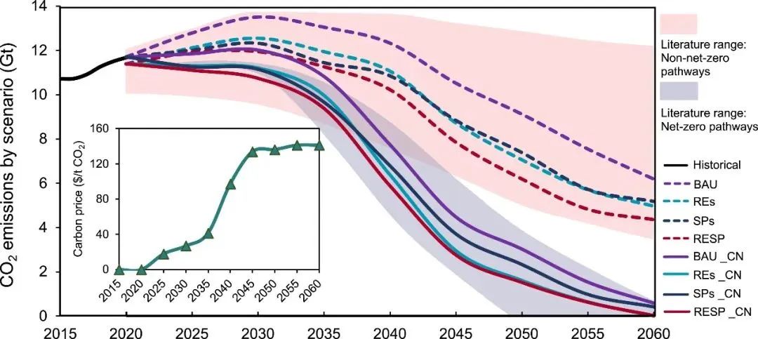 图1. 不同情景下的排放路径和碳价变化情况