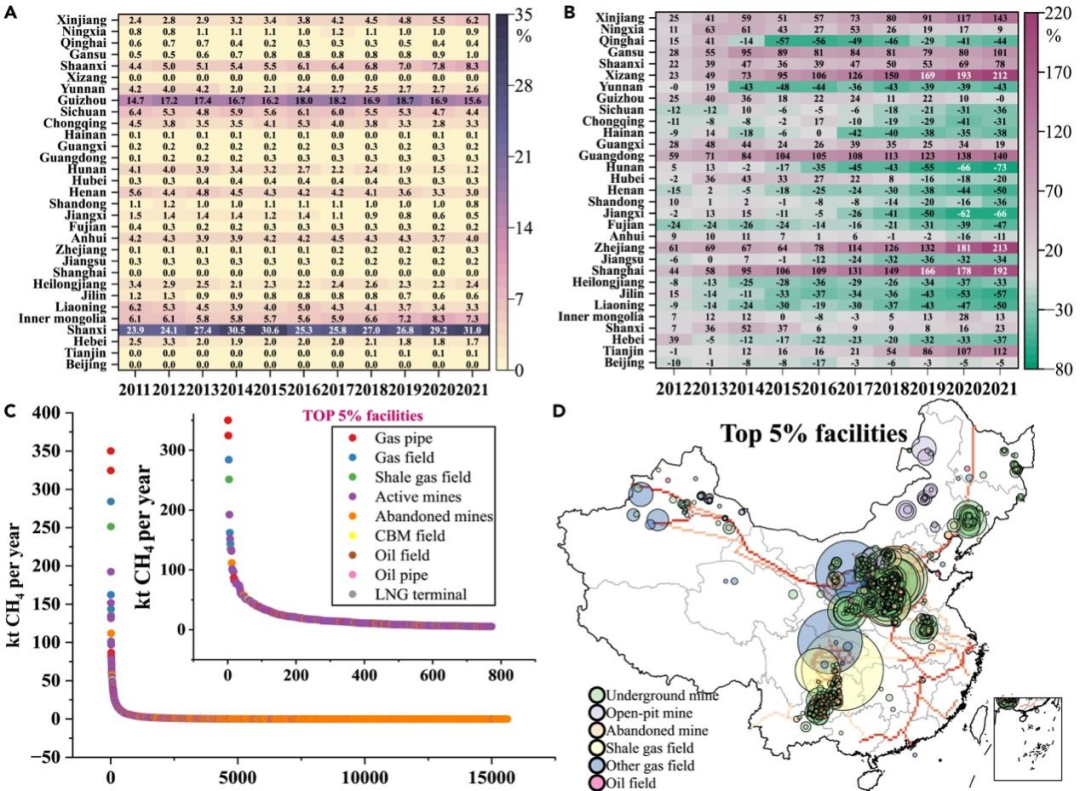 图. 重点排放区域与设施,(A)中国能源甲烷排放的省级分布,(B)各省年度排放量相对于2011年的比例变化,(C)2021年设施层面的排放量,(D)前5%设施的空间分布。