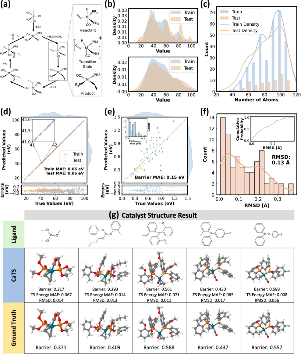 更进一步,团队开发了名为CaTS的过渡态智能筛选框架,瞄准催化剂设计中难度最大、耗时最长的反应动力学优化问题进行攻关。长期以来,过渡态的计算是预测反应速率的关键,但高昂的计算成本是制约大规模筛选的瓶颈。CaTS框架创新性地采用迁移学习策略,仅需数百个催化反应数据即可训练出高精度的机器学习力场,将过渡态搜索的效率提升了近万倍,且在能量和结构预测上均保持了与DFT的高度一致性。相关研究成果以“CaTS:面向催化剂发现的可扩展和有效的过渡状态筛选”(CaTS: Toward Scalable and Efficient Transition State Screening for Catalyst Discovery)为题,于8月27日发表于《美国化学会·催化》(ACS Catalysis)。