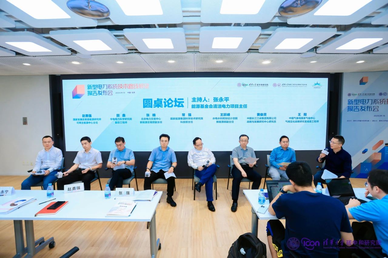 能源基金会清洁电力项目主任张永平主持圆桌讨论,国家发展改革委能源研究所可再生能源中心主任赵勇强、华电电力科学研究院副总工程师田鑫、北京电力交易中心新能源交易部副主任张楠、国家能源集团科学技术研究院科技部主任常强、水电水利规划设计总院新能源部副主任王跃峰、中国长江三峡集团有限公司战略与发展研究中心研究员黄俊灵、中国气象局国家气候中心气候变化战略研究室高级工程师王阳参与讨论。