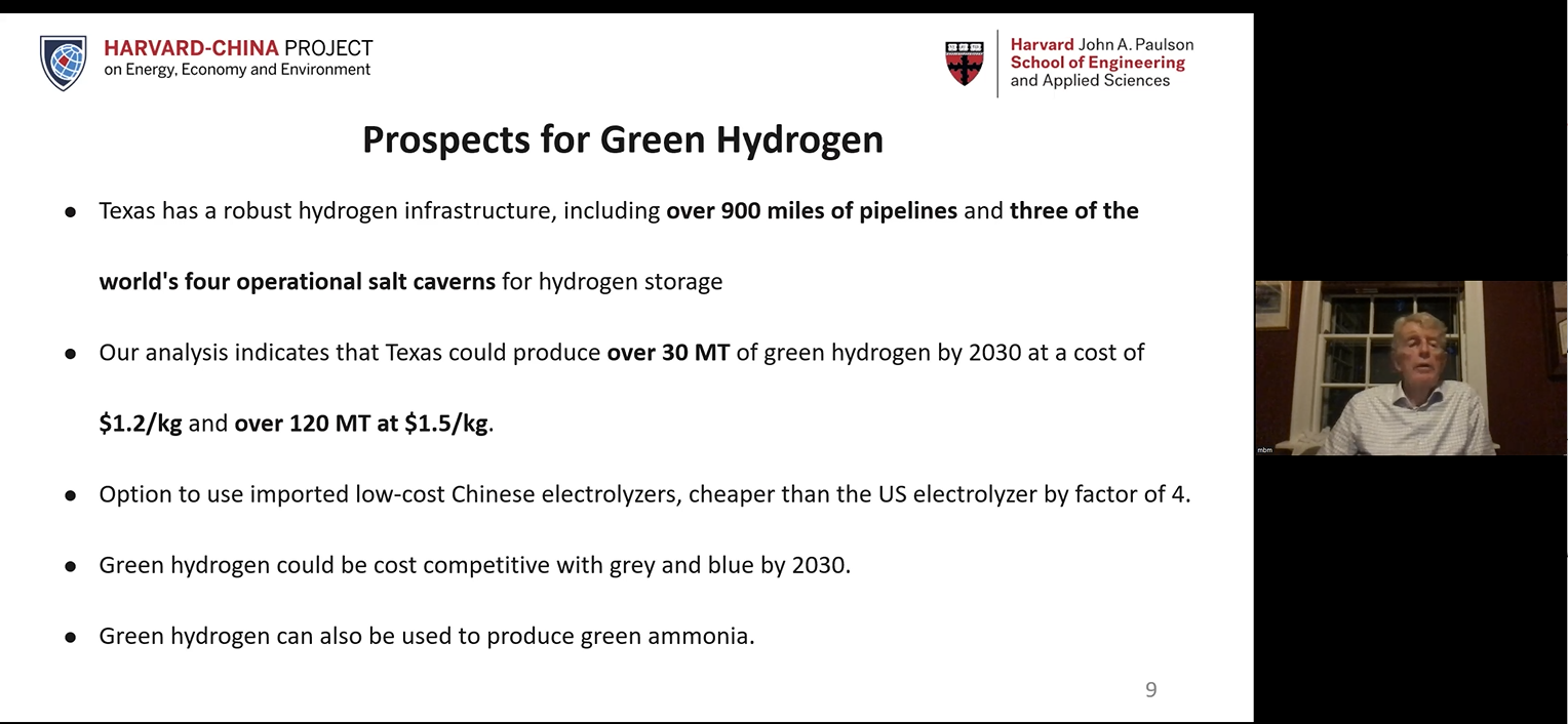 迈克尔·麦克尔罗伊(Michael B. McElroy)在报告中展示了美国和中国在应对气候变化方面所作的承诺,并以美国得克萨斯州为例,介绍了该州碳排放的情况和发展绿氢的潜力。得克萨斯州是美国最大的二氧化碳排放州,但同时也拥有风能、太阳能等丰富的可再生能源,以及强大的氢基础设施。他认为,得克萨斯州的案例可以为中国所借鉴,为相关碳减排路线图的制定提供启发。