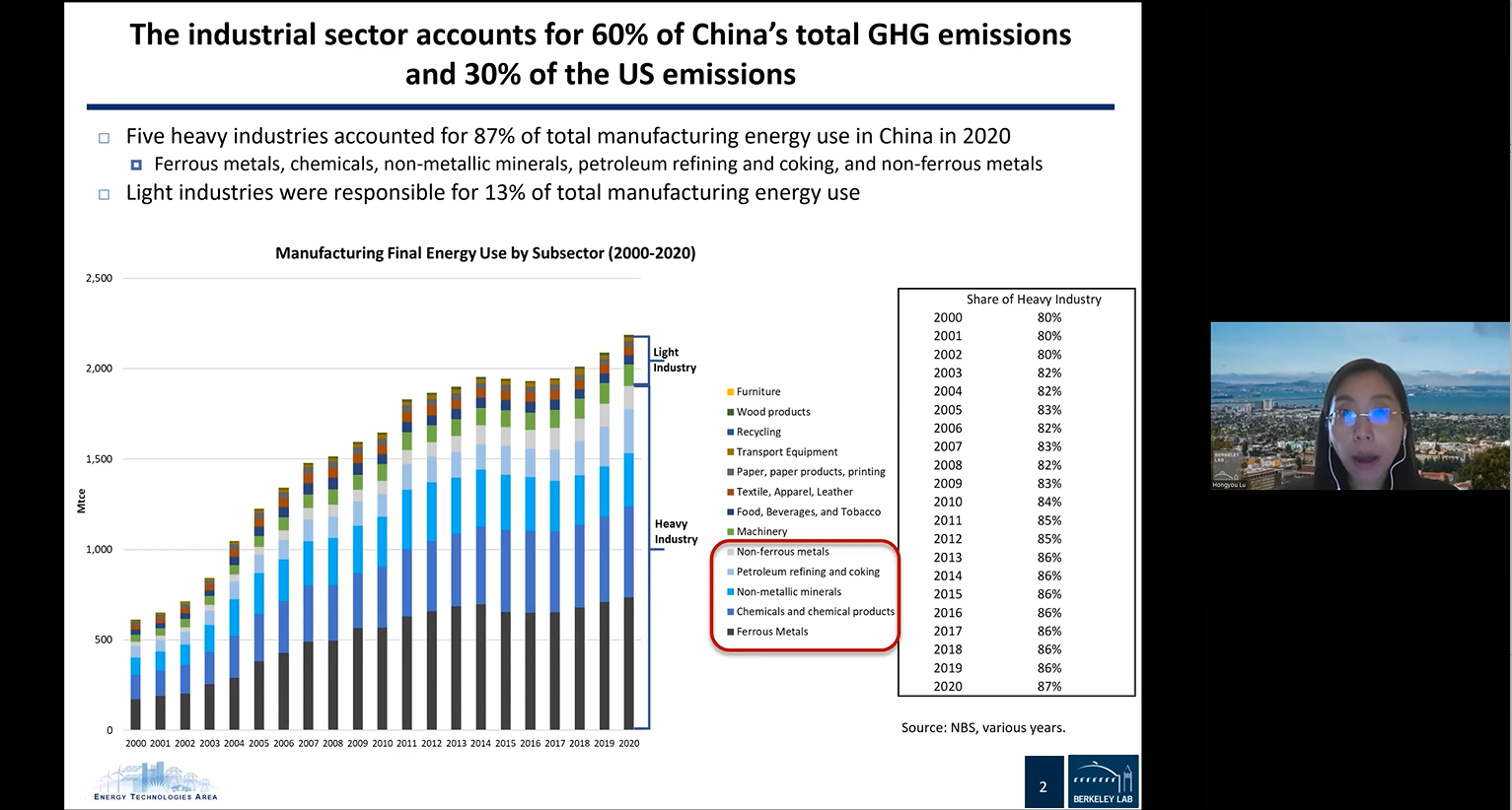 劳伦斯伯克利国家实验室建筑和工业应用部研究员鲁虹佑围绕“工业低碳转型的挑战与机遇”进行了分享。她介绍,工业部门排放占中国温室气体排放的60%,占美国温室气体排放的30%,实现工业低碳发展对于中美两国都非常重要。不同工业部门有着各自的特征,应对低碳技术进行整合和筛选,以应用到不同行业中。她着重介绍了电气化等工业减碳前沿技术,以及这些技术发展面临的挑战和机遇。