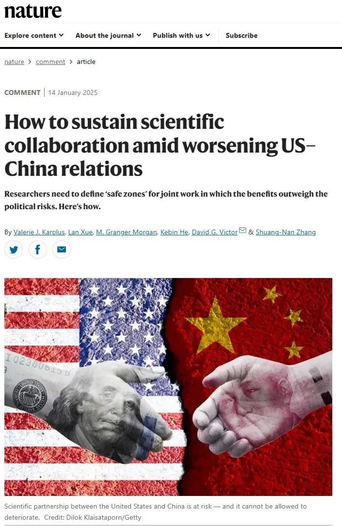 苏世民书院院长、公共管理学院教授薛澜,中国科学院大学教授张双南,卡内基梅隆大学工程与公共政策学院教授Valerie J. Karplus 、M. Granger Morgan,加州大学圣地亚哥分校全球政策与战略学院创新与公共政策教授David G. Victor共同撰写的评论文章How to sustain scientific collaboration amid worsening US-China relations(《地缘政治环境下如何保持中美科技合作》)在Nature刊出。文章剖析了地缘政治环境日益复杂背景下,如何有效维持并推动中美两国在科技领域的深度合作,从而共同促进全球科技的持续进步与创新发展。