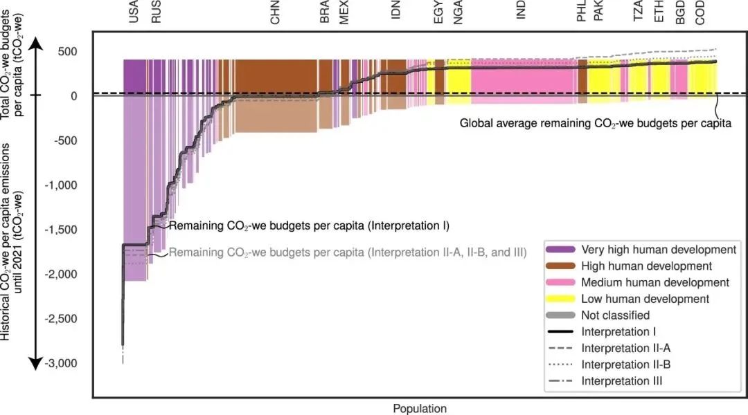 研究结果表明,非常高、高、中等和低人类发展水平国家之间在2021年后的预计贡献量存在明显差异。截至2021年,包括所有主要发达国家在内的84-90个国家已耗尽了1.5℃(50%可能性)目标下的预计贡献量。对于将全球温升限制在2℃(67%可能性)目标的情况,亦基本相同。因此,即便这些国家的NDCs代表了能实现的最大减排力度,其仍将超出自身的预计贡献量。