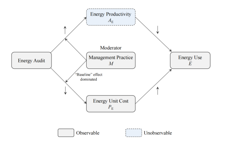 研究团队选取我国山东省48家制造业企业开展随机干预实验,针对变压器、照明、压缩机等设备使用提供节能措施建议,采用双重差分方法分析了能源审计对于用电水平和成本的影响,并通过量化企业的结构化管理水平,进一步分析了管理水平与节能建议采纳和干预效果之间的关系。图1展示了能源审计干预的潜在影响以及各变量之间的联系,其中,“基线效应”是指管理实践薄弱的企业更容易从干预中获取增益的节能措施信息,从而实现更大幅度的单位用能成本下降。
