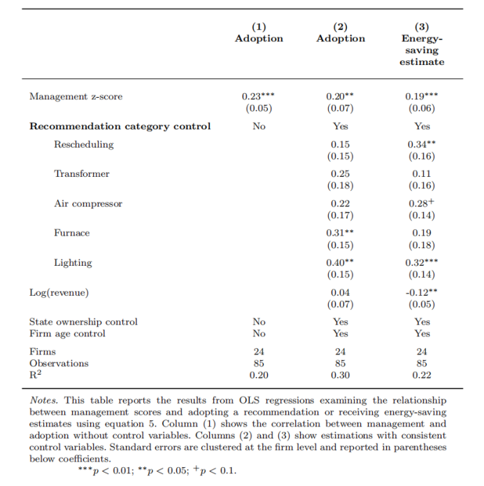 该研究还发现企业自身的管理水平会对节能建议采纳意愿以及能源使用产生影响。如表1所示,管理实践得分(Management z-score)与节能建议采纳率呈正相关,分数每增加1单位标准差,建议采纳的可能性提升20%~30%。相较于管理水平较高的企业,较低管理水平企业在干预后单位用电成本降低的幅度更大,这表明能源审计能够帮助这些企业弥补管理上的不足,从而实现降本增效。此外,研究发现干预效果与节能建议的类型有关,其中,针对变压器的建议是影响结果的主要因素,能使单位电力成本下降16%。这是由于不少较低管理水平企业在干预前向电力公司提交了过高的最大负荷,导致电费计量中的固定成本增加,而针对此问题的建议相对操作简便,因此产生了显著的积极影响。
