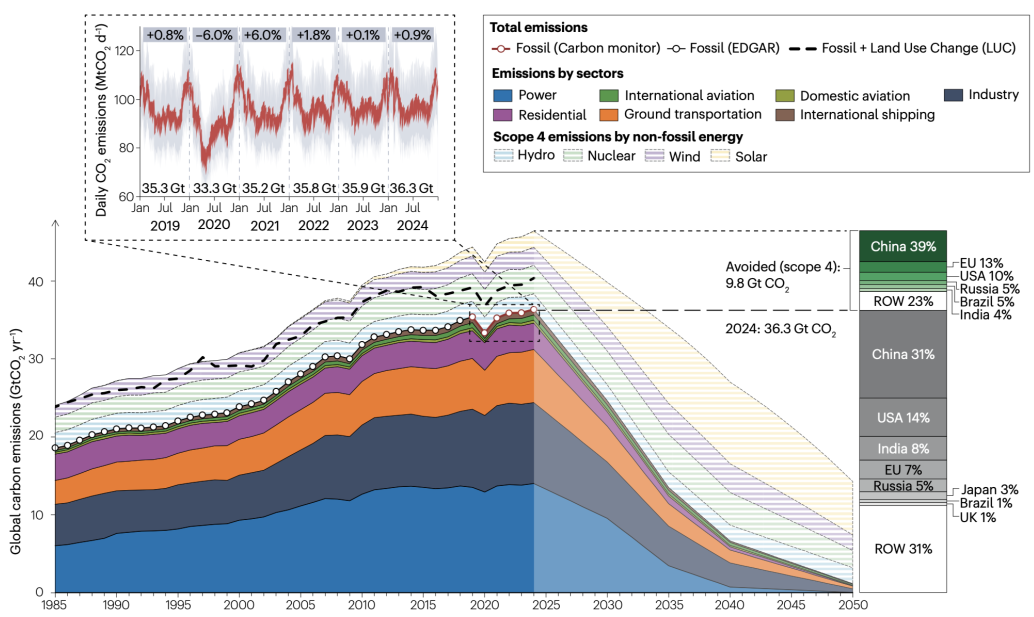 研究基于Carbon Monitor数据(//carbonmonitor.org)分析2024年全球二氧化碳排放量及非化石能源发展带来的减排量。研究表明,2024年全球化石燃料燃烧与水泥生产过程产生363亿吨二氧化碳排放。这一增长态势表明全球碳排放尚未达峰,2020年因疫情冲击碳排放下降6%, 2021-2023年排放增速逐步放缓(年均增速分别为6.0%、1.8%和0.1%),2024年排放增速为0.9%。
