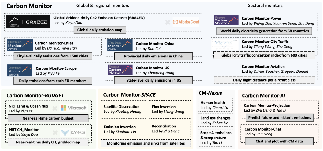 Carbon Monitor基于多部门数据,包括全球电力生产数据(58个国家/地区)、工业生产数据(73个国家/地区)、城市交通拥堵数据(全球406个城市)、人口加权采暖度日数数据(206个国家/地区)以及全球航班飞行和海洋贸易数据,构建了涵盖电力、工业、地面交通、航空、航海、居民等多部门的碳排放量化框架。