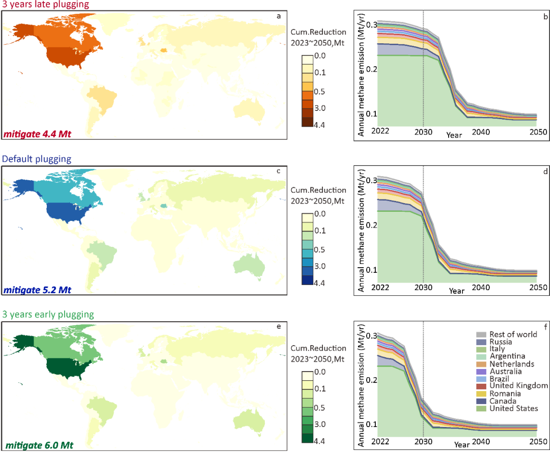 结果显示,若不干预,2023年至2050年全球废弃井将继续排放9.9百万吨甲烷;若按计划推进封堵,可削减53%的累计排放;若提前三年行动,减排比例将升至61%,为实现气候目标节约极其关键的“最后一公里”缓冲空间。