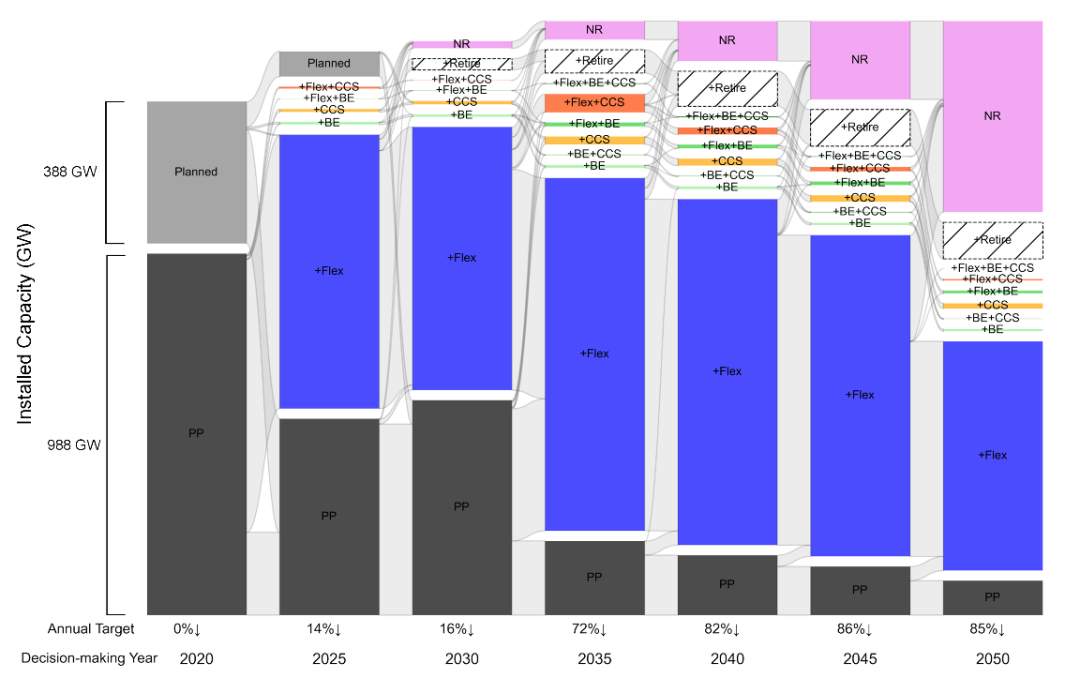 在巴黎协定提出的1.5℃温控目标框架下,全球燃煤电厂排放需要快速下降。然而,中国和印度等发展中国家燃煤电厂的装机容量和数量非常庞大且多为近年来新建,强制退役这些燃煤电厂可能会导致巨额资产搁浅。除了强制退役外,燃煤电厂还可通过生物质掺烧、碳捕获与封存、基于灵活性改造降低发电小时数等改造策略减少排放,或是通过生物质掺烧耦合碳捕获与封存实现负碳排放。而采用过于单一减排策略(如:强制退役)和不合理的碳减排路径则可能会抬高煤电转型成本。