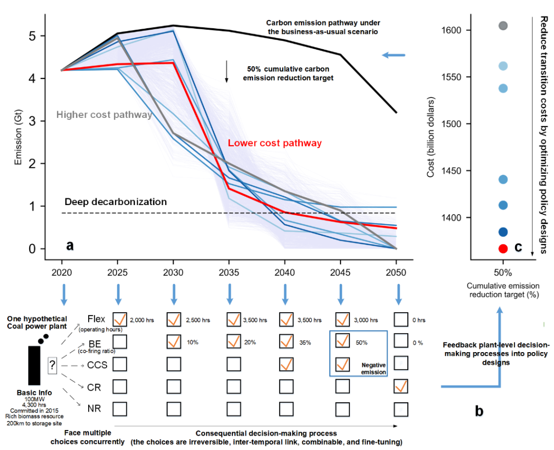 地球系统科学系蔡闻佳教授课题组开发了一个厂级递归动态优化模型(PLAnT-level dynamic Optimization model, PLATO),旨在探究燃煤电厂在多种减排策略下递归动态的转型路径。在该模型中,燃煤电厂可根据自身的装机容量、投产时间、周围生物质资源量、距离碳封存点位的距离等特征,在多种减排策略中进行决策。同时,随着国家碳减排目标的提高,模型将帮助燃煤电厂开展多期的序贯决策。在这一模型基础上,通过构建多条满足相同累计碳减排目标的碳减排情景,研究探究了不同情景的曲线形态对厂级转型路径及其转型成本的影响。