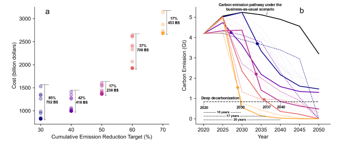 图3. 各累计碳减排目标下成本更低的碳减排情景(图a表示不同累计减排目标下各碳减排情景的转型成本。图b表示不同累计碳减排目标下碳减排情景的曲线形态;实线表示低成本情景;虚线表示高成本情景;曲线颜色与图a对应;深度减排表示二氧化碳排放相比于2020年水平降低80%)