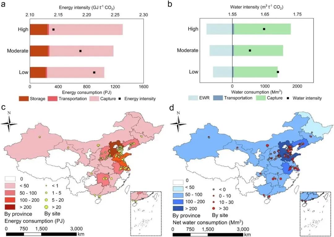 图3. 中国钢铁行业碳捕集与封存技术部署的能源与水资源消耗(a-b总能源与水资源消耗量及其组成(碳捕集、碳运输、碳封存与驱水回收);c-d分省及分地点的能源与水资源消耗)