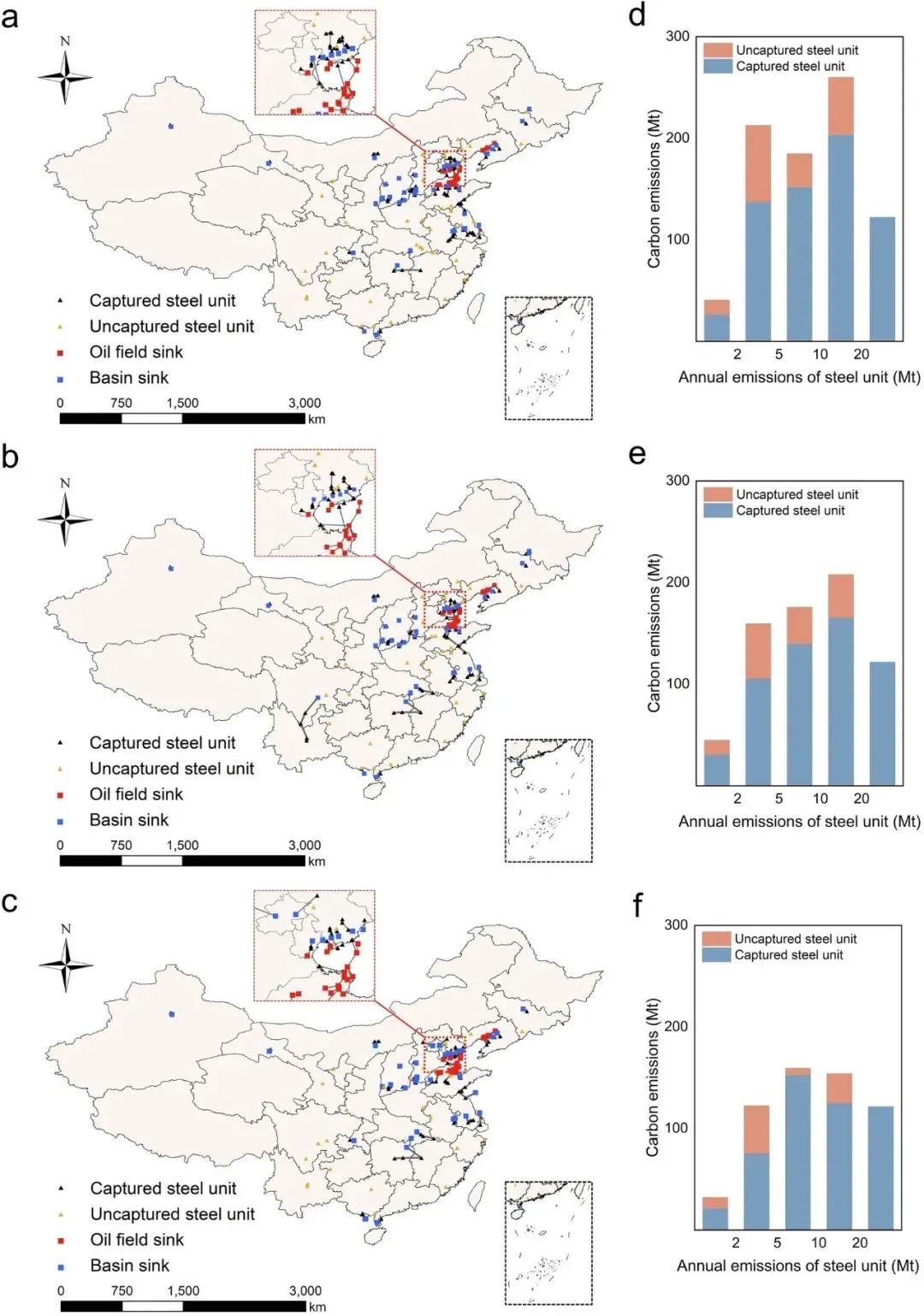 图2. 中国钢铁行业碳捕集与封存技术的最优部署方案(a-c碳捕集与封存技术在高、中、低钢铁产量情景下的空间部署方案;d-f分排放量水平的钢铁企业部署情况)