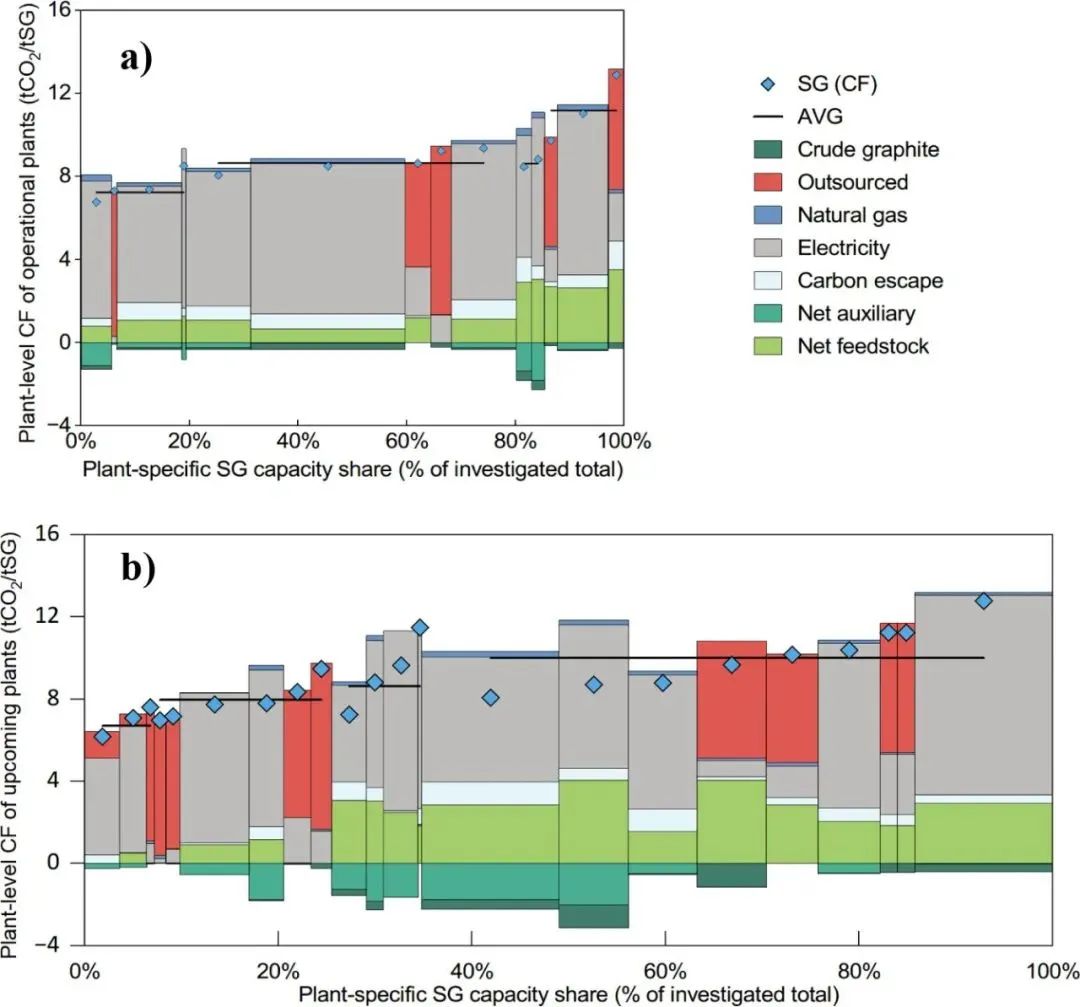图2. 我国分工厂的电池级人造石墨碳足迹(a)投产运营;(b)拟建工厂