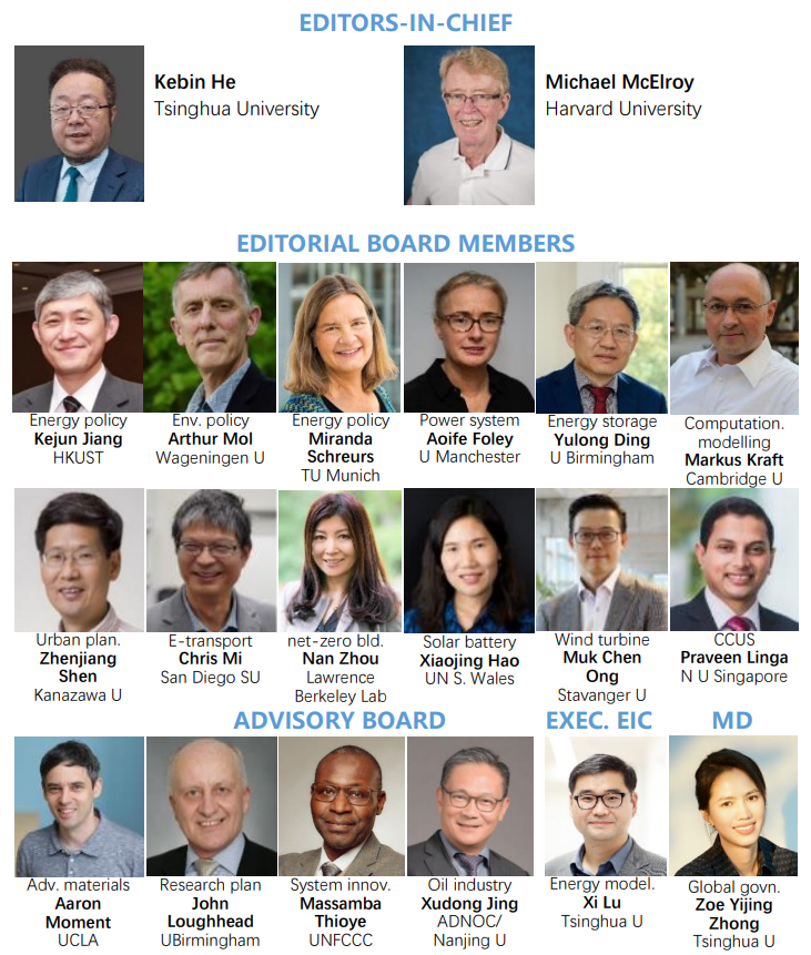 本刊由h图书馆 贺克斌院士与哈佛大学Michael McElroy院士担任联合主编,并邀请了来自9个国家的17位学界和产业界知名专家担任编委、顾问,专长领域覆盖风光、化石能源、储能、电力、CCUS、环境、气候、城市规划、材料、AI与计算、公共政策等,为期刊的全球视野与国际化发展提供了强大支撑。