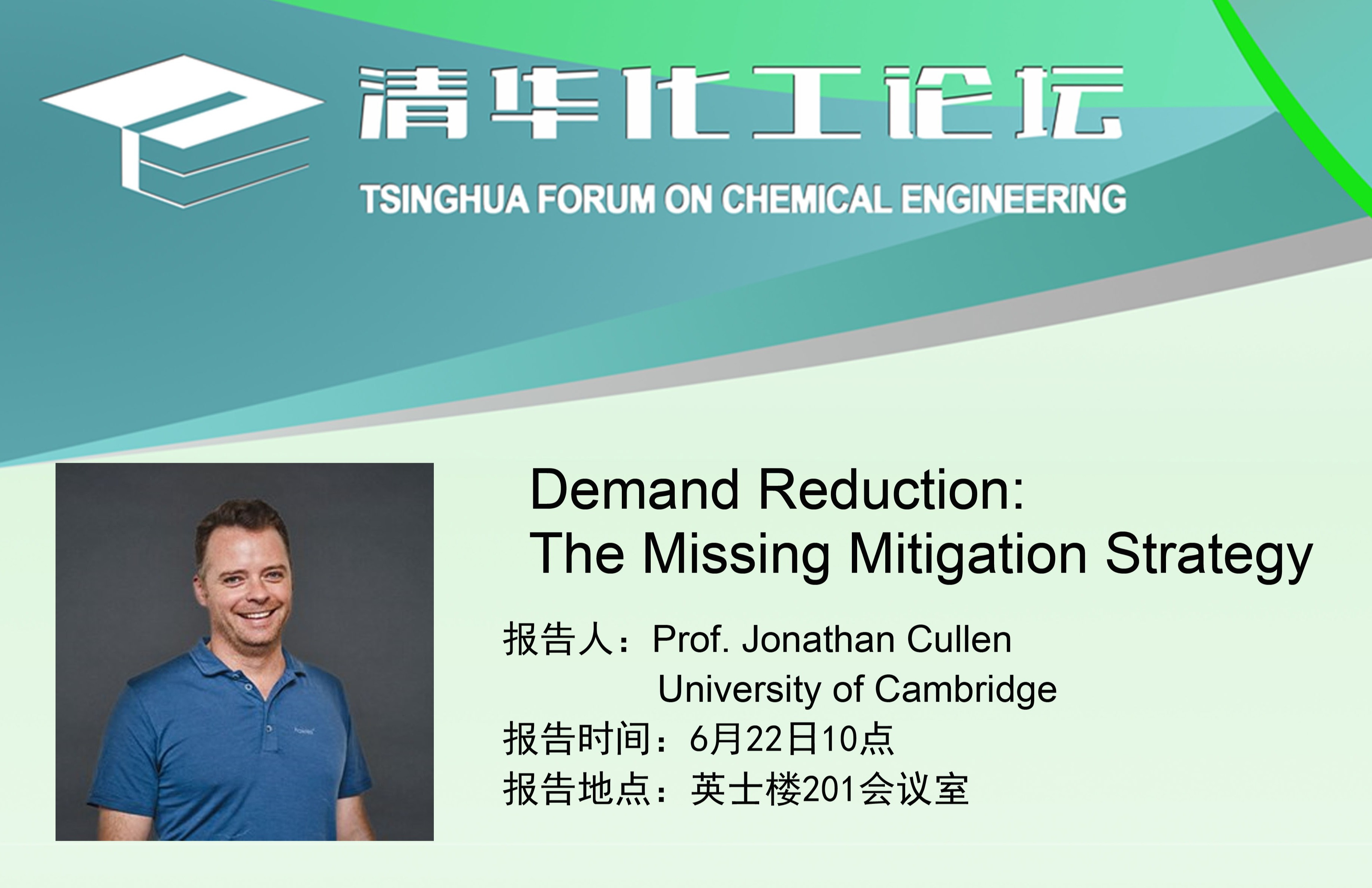 6月22日(周四)上午10:00,剑桥大学Jonathan Cullen教授将作客清华化工论坛,主讲应对气候变化的减碳策略。欢迎有兴趣的老师同学积极参加
