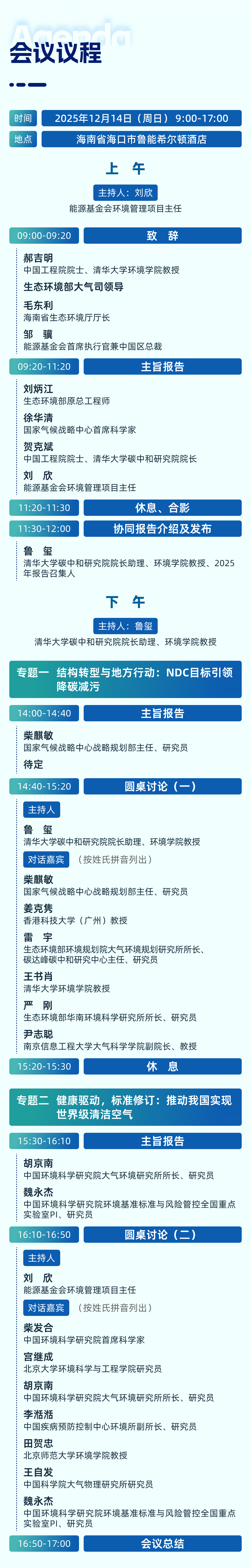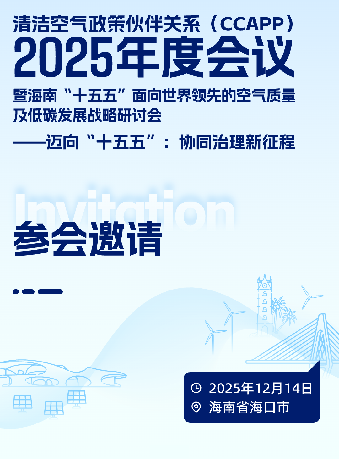 、能源基金会及清洁空气政策伙伴关系(CCAPP)联合海南省环境科学研究院等单位拟于2025年12月14日在海南省海口市召开 “CCAPP 2025年度会议暨海南‘十五五’面向世界领先的空气质量及低碳发展战略研讨会”。会议以 “迈向‘十五五’:协同治理新征程” 为主题,将重点围绕“十五五”降碳减污结构转型与地方行动、健康驱动空气质量标准升级等展开交流研讨。会议期间,CCAPP旗舰报告《中国碳中和与清洁空气协同路径(2025)》也将重磅发布。